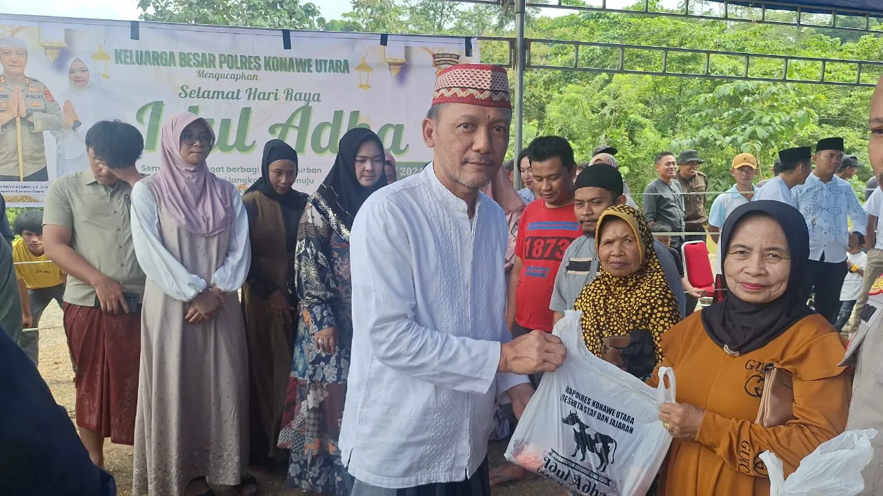 Kepala Kepolisian Resor Konawe utara AKBP Priyo Utomo, S.H., S.I.K bersama Ketua Bhayangkari Cabang Ny. Rosana Priyo utomo serta Wakapolres menyerahkan langsung daging kurban kepada masyarakat bertempat di halaman Mapolres Konut, Senin (17/6/24)