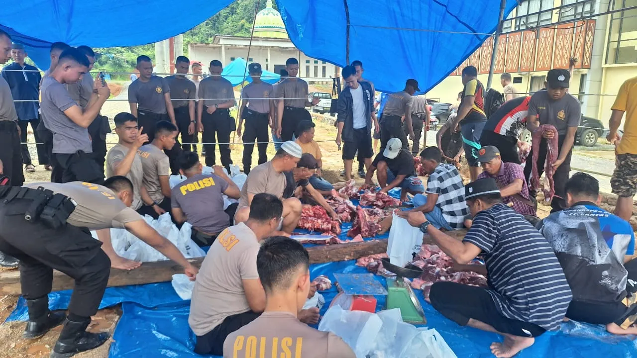 16 ekor sapi kurban di sembeli di halaman mako Polres Konawe utara, kemudian di bagikan kepada warga layak penerima kurban dari 600 kupon yang telah disebar kepada warga serta 100 plastik berisi 2 kilo untuk warga yang tidak memiliki kupon