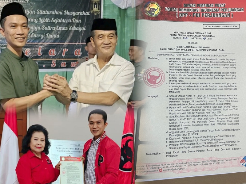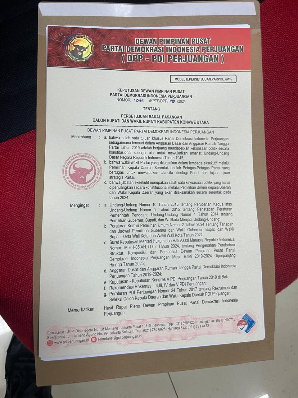 Pasangan dengan tagline BERIKRAR ini resmi mendapatkan dukungan dari PDIP berupa Rekomendasi B1KWK tentang pengesahan pasangan calon kepala daerah dan calon wakil kepala daerah dalam rangka mengikuti pemilihan bupati dan wakil bupati Kabupaten Konawe Utara dari Partai PDIP pada Pilkada serentak tahun 2024.