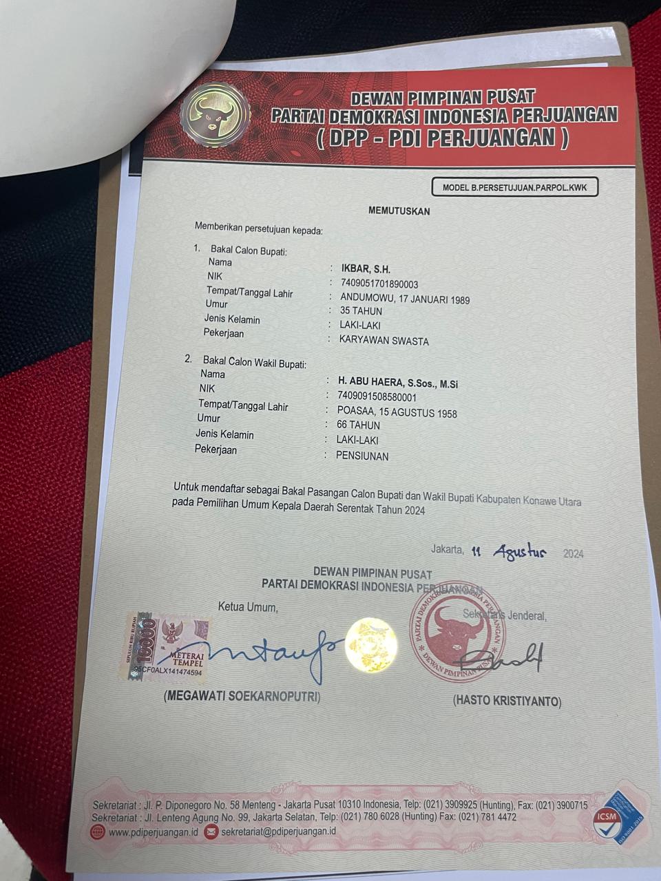Ikbar calon Bupati Konut pasangan dari calon wakil Bupati Konut, Abu Haera resmi terima rekomendasi dukungan PDIP pada Tanggal 11 Agustus 2024 di Gedung PDIP di Jakarta. Dan ditanda tangani langsung oleh Ketua Umum PDIP, Megawati Soekarnoputri.
