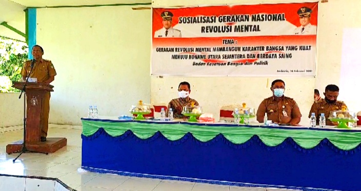 Indosultra.Com, Konawe Utara-Plt Sekertaris Daerah (Sekda) Konawe Utara (Konut), Sulawesi Tenggara (Sultra), Kasim Pagala secara resmi membuka kegiatan sosialisasi Gerakan Nasional Revolusi Mental bertempat di Aula Balai pertemuan Kelurahan Andowia, Kecamatan Andowia, Selasa (16/02/2021).
