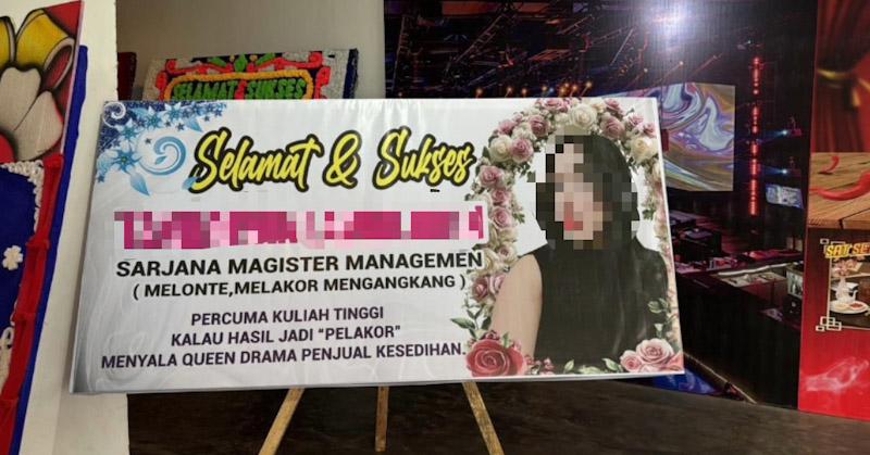“Pelakor yang sudah bertahun-tahun tidur sama suami orang sampai punya anak yang tidak punya status sah di mata hukum dan agama. Tidak perlu dihina karena sudah terhina,” demikian tulisan yang terpampang di karangan bunga tersebut.