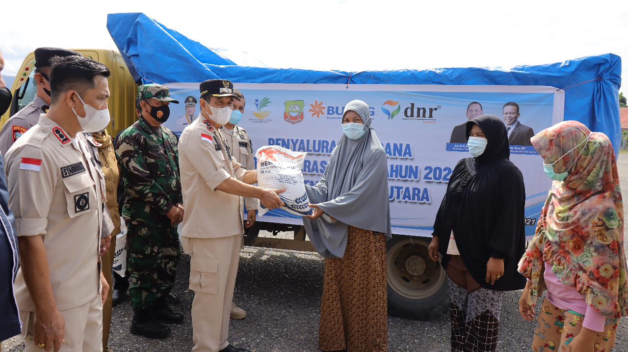 Ketgam: Wakil Bupati Konut, Abu Haera saat melakukan serah terima bantuan beras dari Perum Bulog Kanwil Sulltra.(Indosultra.Com)