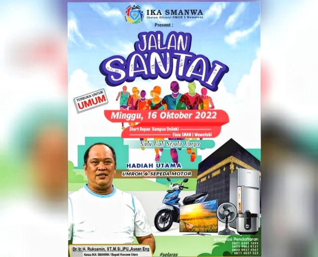 Acara tersebut akan diselenggarakan, tanggal 16 oktober 2022, star depan Kampus Unilaki dan finish di SMAN 1 Wawotobi. Bersama Ruksamin wajudkan kebersamaaan “Satu Hati Sejuta Karya”.