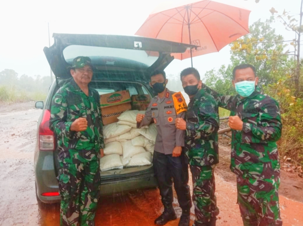 Ketgam: Danlat Batalion 725 Woroagi, Mayor Infantri, Musakrin bersama Danramil Lasolo, dan Perwira Penghubung (Pabung) TNI Kodim Kendari saat menerima bantuan bahan makanan yang diserahkan langsung Kapolres Konut AKBP Achmad Fathul Ulum dipusat latihan wilayah Mandiodo, Konawe Utara. (Indosultra.Com).