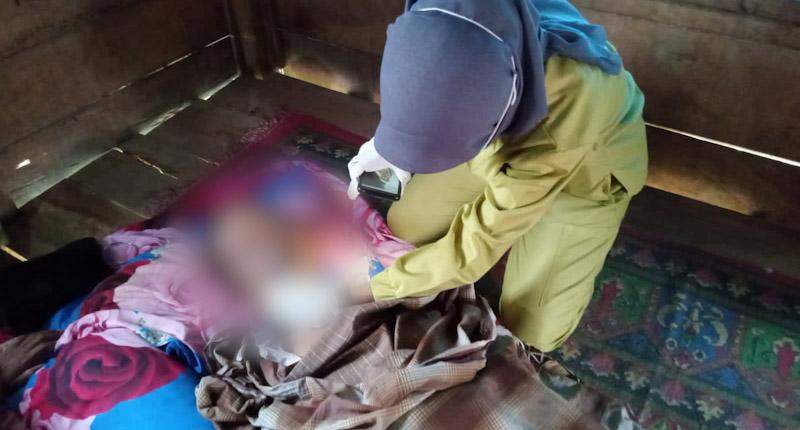 Setelah itu, anaknya mencari almarhum sampai di luar rumah tidak lama kemudian Almarhum di temukan di samping rumah di bawah baliho dalam kondisi tergantung dengan selang air di lehernya dan sudah tidak bernyawa.