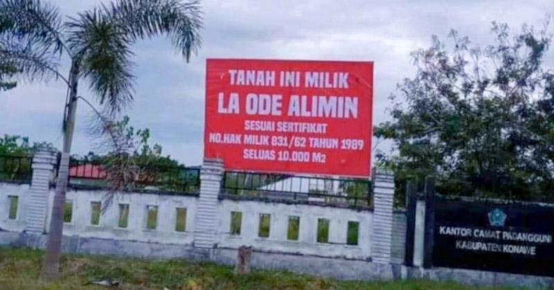 Gambar penyegelan kantor camat tersebut beredar di group facebook dan WhatsApp pada Jumat ( 21/1/ 2022). Dalam gambar tersebut, terpampang baliho yang bertuliskan ” Tanah ini milik La Ode Alimin sesuai Sertifikat No. Hak Milik 831/62 tahun 1989 seluas 10.000 M2″.
