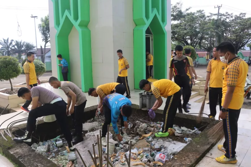 Secara bergotong royong Polres Konawe utara melaksanakan bersih-bersih halaman dan didalam mesjid baik dilakukan dengan menyapu, mencabut rumput, membakar sampah hingga merapikan fasilitas tempat ibadah