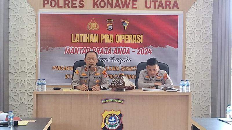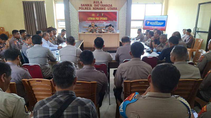 Latihan pra operasi dipimpin Kepala Kepolisian Resor (Kapolres) AKBP Priyo Utomo, S.H., S.I.K bertempat di Aula Sanika Satyawada Polres Konawe utara Kelurahan Wanggudu Kecamatan Asera Kabupaten Konawe utara