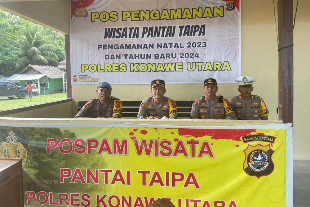 Kapolres Konawe utara dan rombongan pertama kali mengecek Pospam Nataru Polsek sawa yang berada di Desa Tongalino selanjutnya menuju Pospam Wisata Pantai Taipa Kecamatan Lembo Kabupaten Konawe utara
