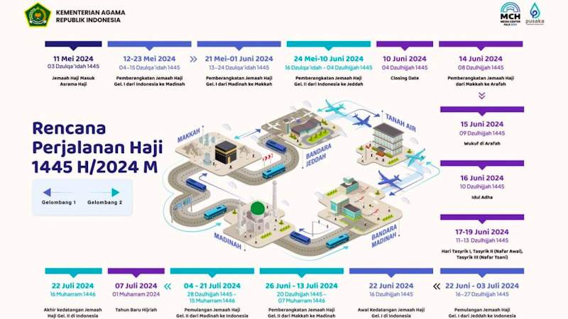 Tahun ini Indonesia rencananya akan memberangkatkan 241 ribu jemaah haji. Seperti tahun-tahun sebelumnya, calon jemaah haji akan masuk ke asrama sehari sebelum jadwal pemberangkatan dilaksanakan. Berikut rincian Rencana Perjalanan Haji 1445 H/2024 M: