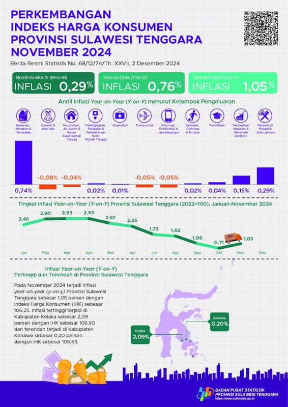 Plt. Kepala BPS Sultra Surianti Toar mengatakan, bahwa di bulan November 2024 kemarin inflasi year on year (y-on-y) Provinsi Sulawesi Tenggara sebesar 1,05 persen dengan Indeks Harga Konsumen (IHK) sebesar 106,25.