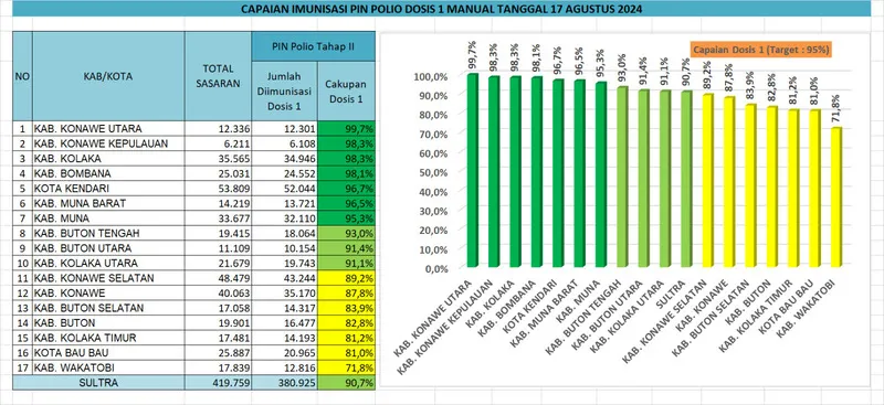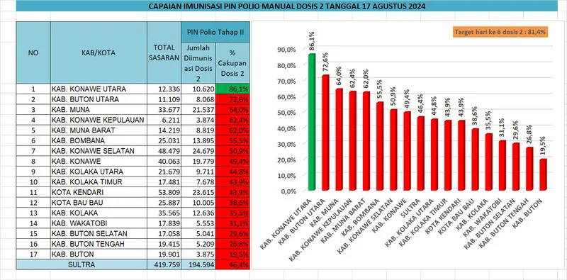Terbukti pada pelaksanaan Imunisasi Nasional Polio dosis tahap 2, Konawe Utara kembali berhasil menduduki peringkat teratas dari 17 kabupaten/kota se-Sultra yang sukses menjalankan program pemberantasan penyakit lumpuh layu dengan total 81,6 Persen data ini akan terus naik.