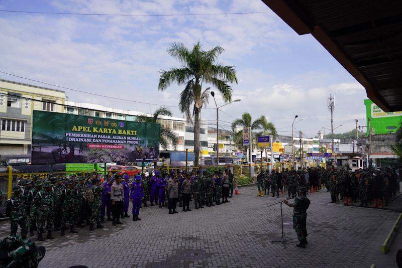 Indosultra.Com,Kendari – Cegah wabah penyakit Kodim 1417/Kendari menggelar kegiatan Karya Bakti Pembersihan Pasar di Kota Kendari yang dipimpin oleh Dandim 1417/Kdi Kolonel Czi Bintarto Joko Yulianto S.IP.,M.Han dan diikuti 200 orang personel Gabungan TNI-Polri, Pemkot Kendari serta masyarakat, pada Kamis (7/12/2023).