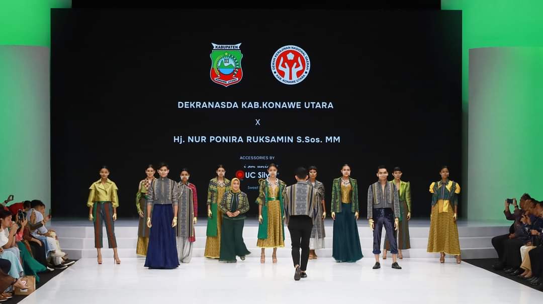 Dekranasda Kabupaten Konawe Utara yang di nahkodai Hj Nurponirah, menampilkan tenunan khas Konawe Utara dengan desainer ternama Defrico Audy.