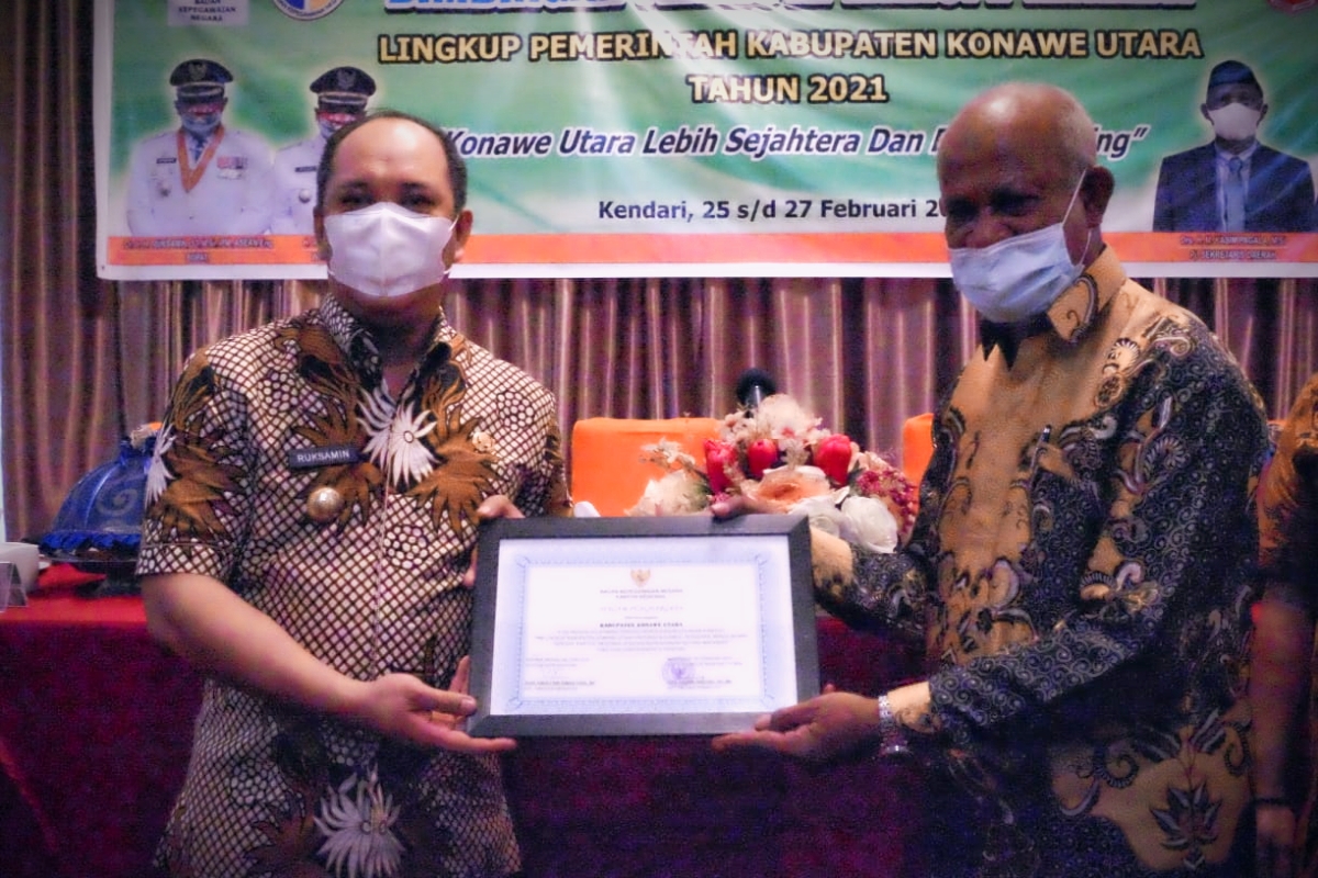 Ketgam: Bupati Konut, Ruksamin saat menerima penghargaan dari Kepala Kantor Regional IV BKN Makassar Harun Arsyad diacara bimtek E-kinerja di Kota Kendari. (Foto:Istimewah).