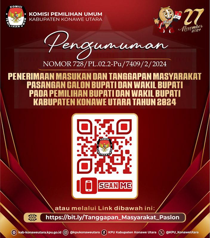 KPU Konut Umumkan Penerimaan Masukan Dan Tanggapan Masyarakat Terhadap Paslon Bupati Dan Wakil Bupati, Klik Dan Lihat Ulasannya!!! 07:48 | 15 September 2024 95 Views Download File