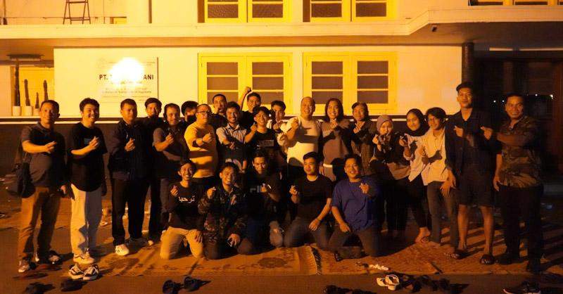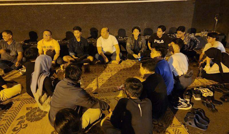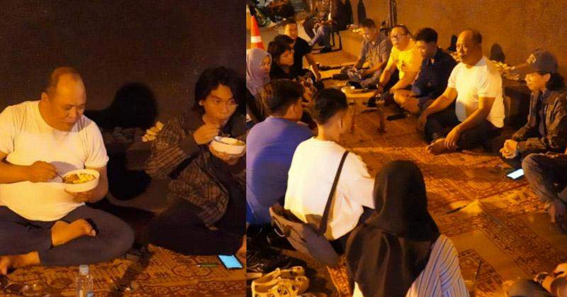 Mengenakan kaos oblong berwarna putih, Ruksamin duduk melantai bersama puluhan mahasiswa-mahasiswi sembari makan minum bersama tanpa ada jarak.