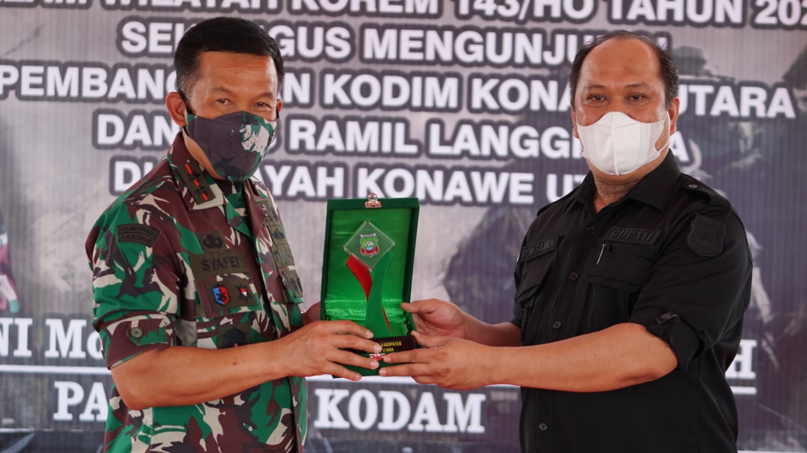 Ketgam: Panglima Komando Daerah Militer (Pangdam) XIV Hasanuddin, Mayjen TNI Mochamad Syafei Kasno saat menerima cendera mata dari Bupati Konut, Ruksamin saat melakukan kunjungan kerja.(Foto: Istimewah)