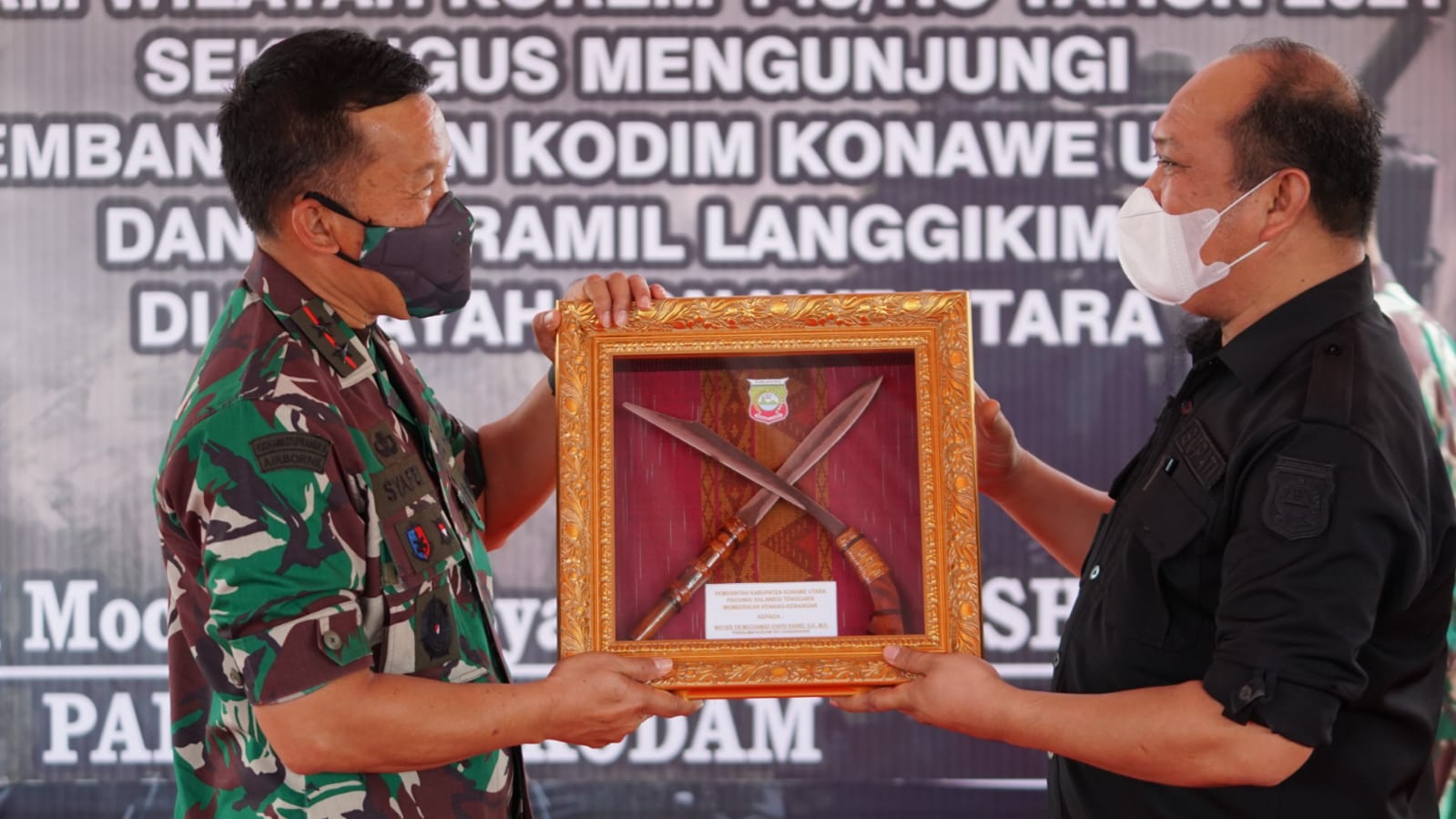 Kegiatan tersebut diakhiri dengan penyerahan plakat dan cinderamata yang diserahkan langsung oleh Bupati Kepada Pangdam, selanjutnya kain tenun khas Konasara diserahkan Wabup kepada Pangdam.**(IS)