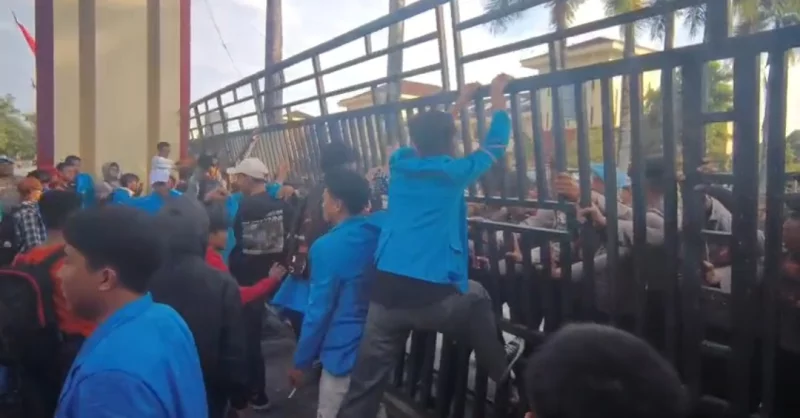 Pantauan Indosultra.com memperlihatkan massa aksi sempat mendorong pintu gerbang Mapolda hingga akhirnya berhasil didobrak. Suasana sempat memanas setelah mahasiswa memaksa masuk ke dalam halaman.
