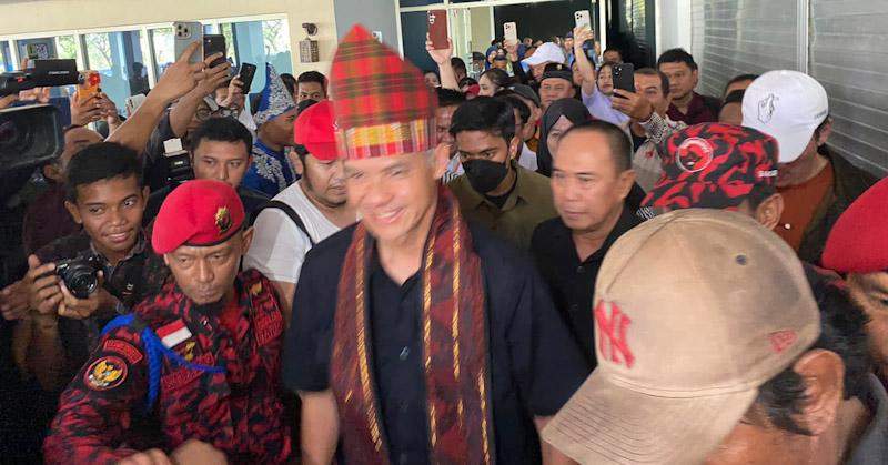 Indosultra.Com,Kendari – Calon Presiden nomor urut 3, Ganjar Pranowo disambut antusias saat tiba di Bandara Haluoleo, Kabupaten Konawe Selatan (Konsel), Provinsi Sulawesi Tenggara (Sultra) pada Minggu 3 Desember 2023.