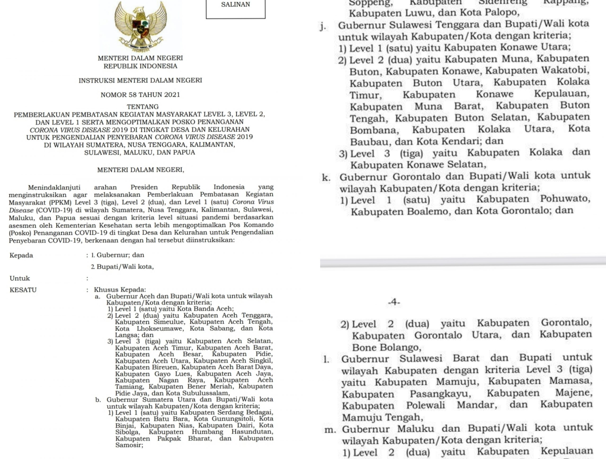 Instruksi Kemendari RI berisikan tentang Pemberlakuan Pembatasan Kegiatan Masyarakat (PPKM), level 3, 2, 1, serta mengoptimalkan posko penanganan Covid-19 di tingkat desa dan kelurahan untuk pengendalian penyebaran covid-19 di wilayah Sumatera, Nuasa Tenggara, Kalimantan, Sulawesi, Maluku, dan Papua.