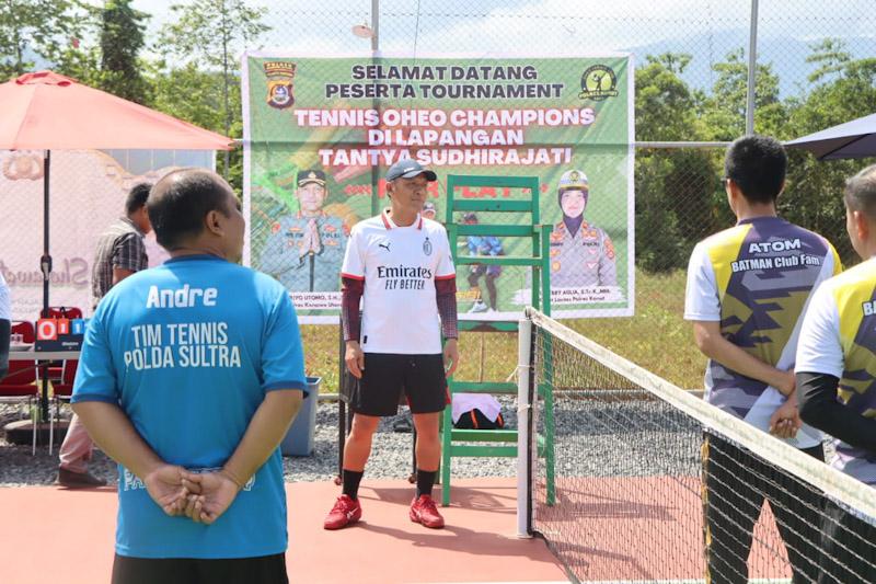 Selamat datang dan selamat bertanding para atlet tenis mania kota kendari dalam ajang turnamen tenis oheo champions memperingati gari jadi polwan ke-76 dan hari lalu lintas keke “tutur Kapolres konut