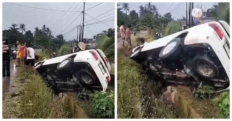 Mobil dengan plat polisi DP 1168 FK itu terbalik dan masuk kedalam got.