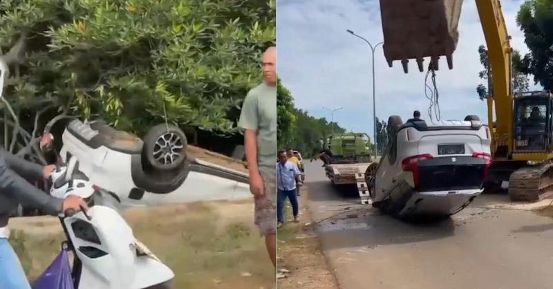 Sebuah mobil Suzuki Exel putih dengan nomor polisi DT 1831 mengalami lepas kendali dan menabrak drainase, sebelum akhirnya terjun ke area pohon bakau di pinggir jalan.
