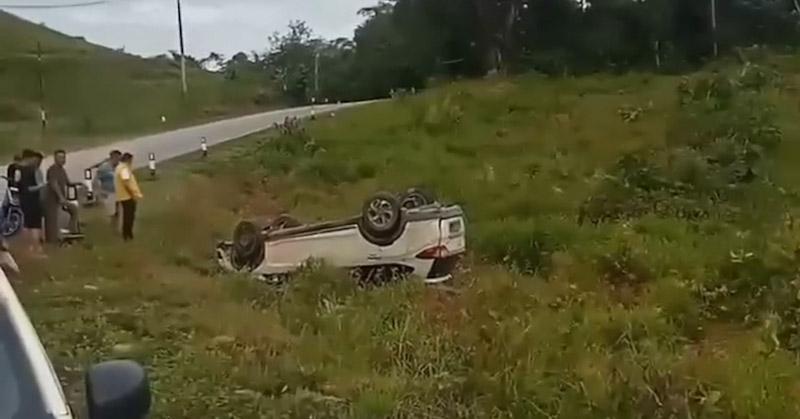Sebuah mobil Honda WR-V berwarna putih dengan nomor polisi DT 1263 EF terguling hebat setelah pecah ban saat melaju kencang di tikungan tajam. Kendaraan tersebut bahkan terlempar keluar jalur dan mengalami kerusakan parah.