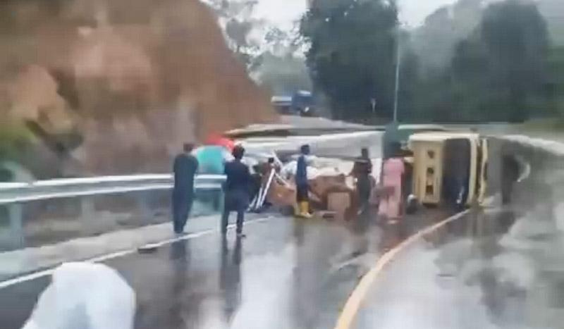 Dari video yang diterima media ini, terlihat mobil truk tersebut terbalik di pinggir jalan KM 12 dan menutup setengah bahu jalan itu.