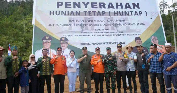 Bupati Konut Ruksamin menyerahkan bantuan huntap secara langsung kepada masyarakat korban banjir yang berada di Desa Puusuli, Desa Puuwanggudu, Desa Alaa Wanggudu dan Desa Longeo Utama.