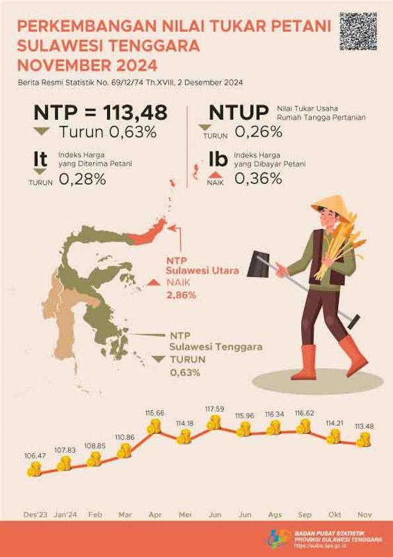 “NTP Sultra bulan November 2024 turun 0,63 persen dari 114,21 menjadi 113,48. Penurunan NTP ini disebabkan karena indeks harga yang diterima petani turun sebesar 0,28 persen, sedangkan indeks harga yang dibayar petani naik sebesar 0,36 persen,” katanya.