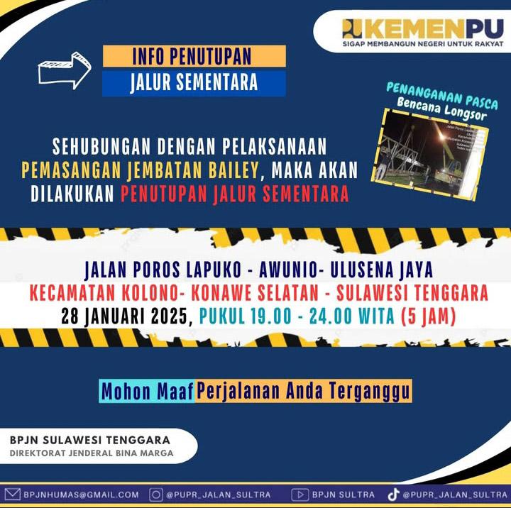 Dalam unggahan BPJN Sultra pada akun instangram @pu_jalan_sultra info penutupan jalur sementara, sehubungan dengan pelaksanaan pemasangan jembatan Bailey, makan akan dilakukan penutupan jalur sementara.