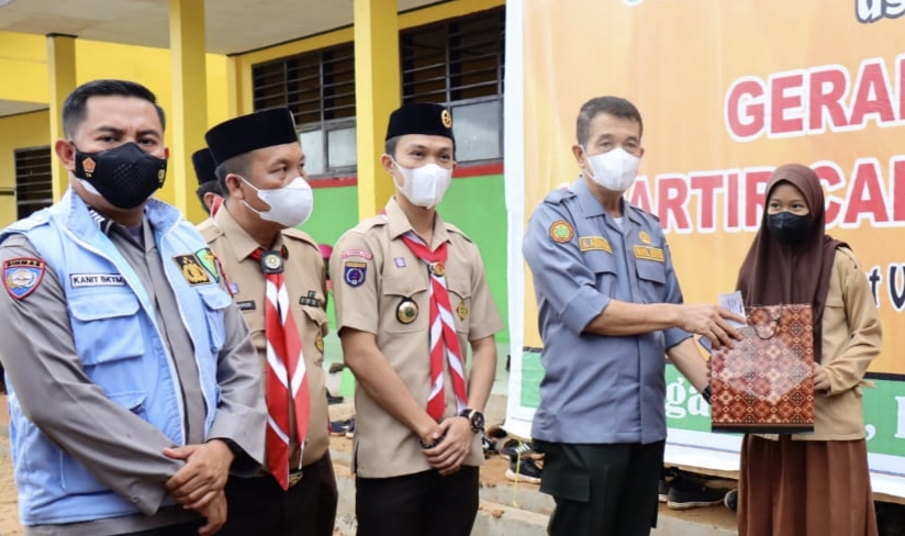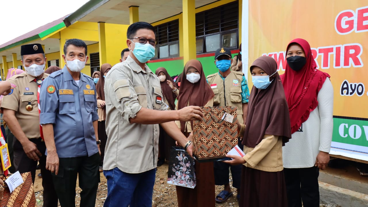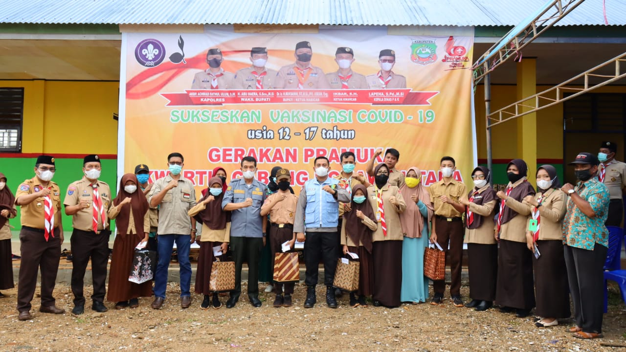 Ketgam: Wakil Bupati Konut, Abu Haera bersama Ketua Kwarcab Pramuka Konut, Ikbar dan jajarannya, bersama Kapolres Konut dan jajarannya saat memberikan bingkisan kepada siswa sekolah usai mengikuti vaksinasi covid-19 di SMP 2 Asera, Kamis (12/9/2021). (Indosultra.Com).