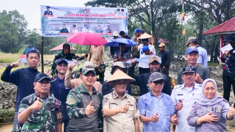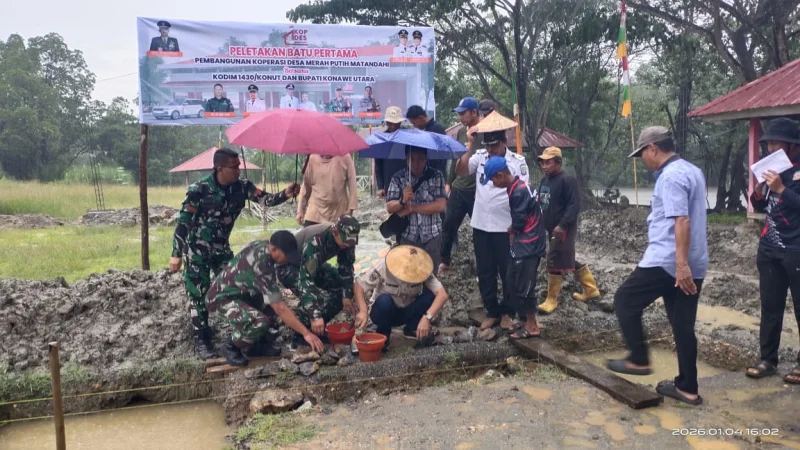 Indosultra.Com, Konawe Utara – Pemerintah Kabupaten (Pemkab) Konawe Utara (Konut) bersama Kodim 1430 Konut laksanakan kegiatan peletakan batu pertama pembangunan Koperasi Desa/Kelurahan Merah Putih (KDMP) di Desa Matandahi, Kecamatan Motui, Minggu 4 Januari 2026.