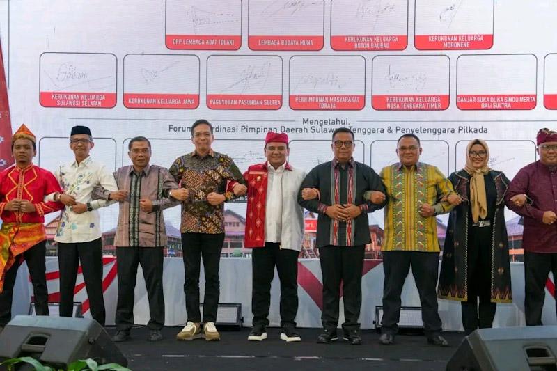 Selanjutnya, kegiatan dilanjutkan dengan penandatanganan deklarasi Pemilu Damai oleh Forkopimda Tingkat I Provinsi Sultra dan Tokoh Paguyuban Kesukuan se-Provinsi Sultra.