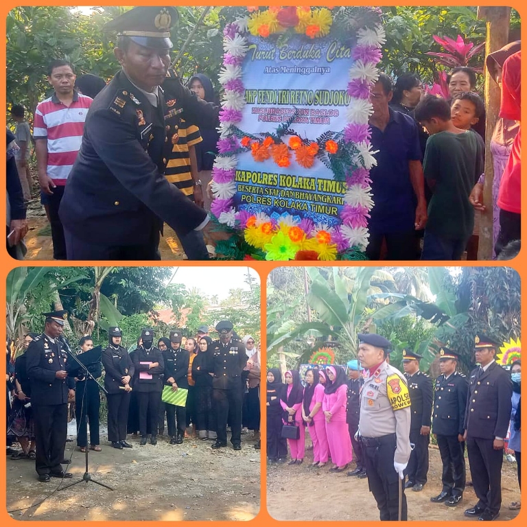 Upacara pemakaman dipimpin oleh Kabag Sumda Polres Kolaka Timur, AKP Syariddin SH, yang mewakili Kapolres Kolaka Timur. Dalam suasana khidmat, AKP Syariddin SH memimpin prosesi dengan penuh rasa hormat, dari pengusungan jenazah hingga penyampaian doa dan tabur bunga.