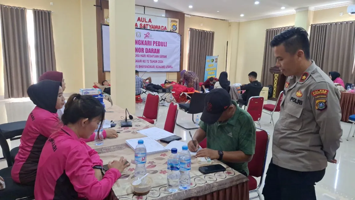 Indosultra.Com, Konawe Utara – Kepolisian Resor (Polres) Konawe utara (Konut) jelang hari bhayangkara ke-78 dan hari kesatuan gerak bhayangkari (HKGB) ke-72 tahun 2024 menggelar bakti kesehatan berupa giat donor darah, kamis (20/6/24)