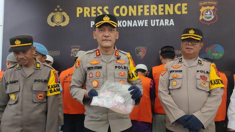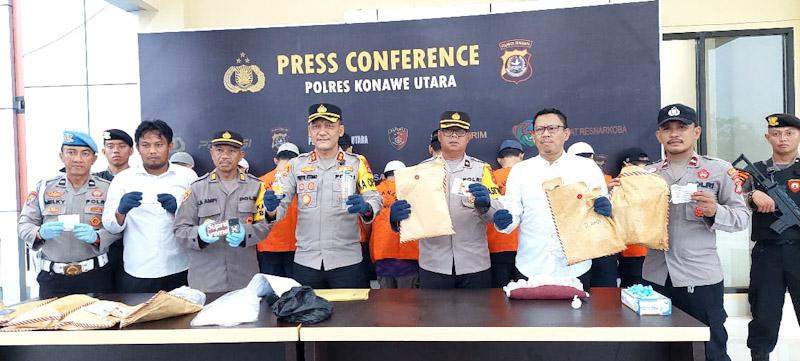 Kapolres Konut AKBP Priyo Utomo, S.H., S.I.K didampingi Kabagren Kompol Muhammad Basir, Kabaglog AKP La Ampi serta Kasat Resnarkoba Iptu Ramlang, gelar Press release hasil penangkapan narkoba.