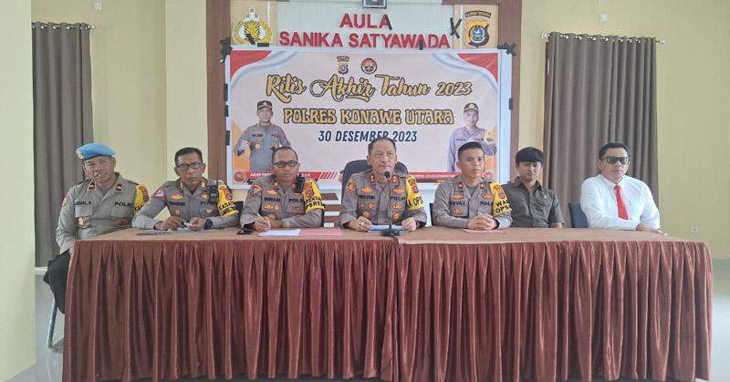 Rilis Akhir Tahun 2023 Polres Konawe utara dihadiri Wakapolres Kompol Urva Lomansyah, S.Si., S.I.K., M.H, Kabag, Kasat Reskrim, Kasat Lantas dan Kasat Narkoba Polres Konawe Utara