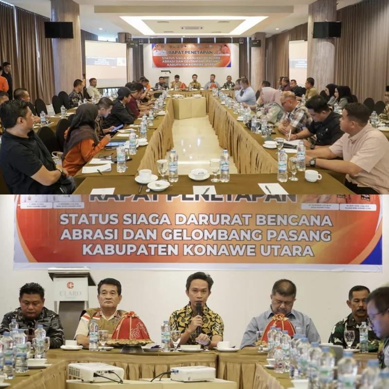 Indosultra.com, Konawe Utara – Dalam upaya cepat dan terukur menghadapi ancaman abrasi dan gelombang pasang yang melanda wilayah pesisir Kabupaten Konut, Bupati Konawe Utara, H. Ikbar, S.H., M.H., memimpin langsung Rapat Penetapan Status Siaga Darurat Bencana Abrasi dan Gelombang Pasang yang berlangsung disalah satu Hotel di Kendari, Jumat (26/9/2025).