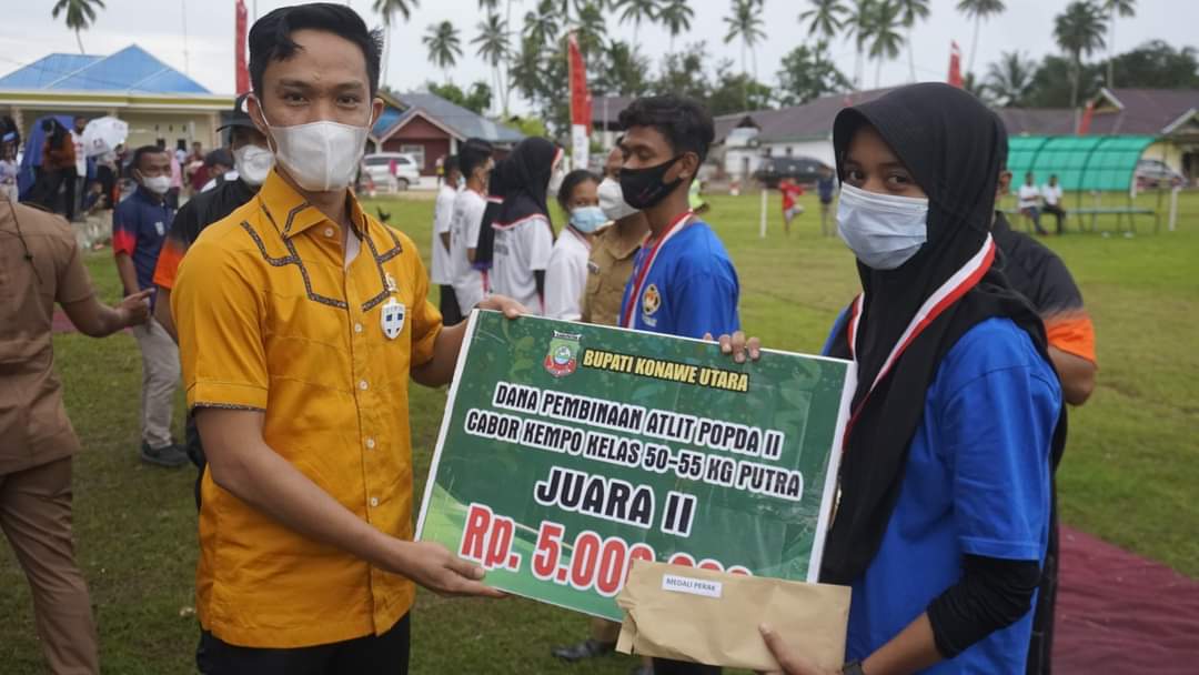 Ketgam: Ketua DPRD Konut, Ikbar saat menyerahkan dana pembinaan kepada atlet berprestasi POPDA ll.(Indosultra.Com)