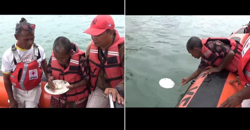 Dengan khidmat, ia meletakkan piring tersebut di permukaan laut, lalu melepaskan telur satu per satu ke air, membiarkannya hanyut bersama arus. Aksi ini menjadi pemandangan yang tak biasa dan mencuri perhatian ratusan warga yang memadati area sekitar jembatan.