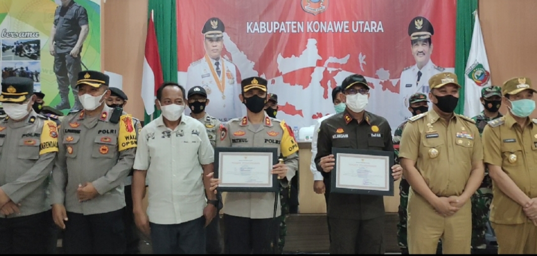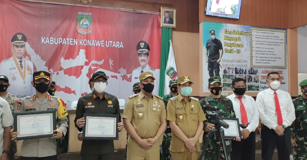 Atas prestasi itu, seluruh personil yang bertugas mulai dari Pimpinan dan jajaran Polres Konut, TNI Kodim 1417/Kedari, Kejari Konawe, Satgas Covid Konut dan Forkompimda Konut peroleh piagam penghargaan sebagai pahlawan pelindung masyarakat.