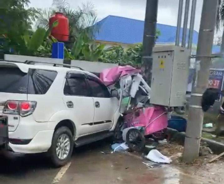 Berdasarkan vidio yang diterima media ini, mobil merek fortuner warna putih dengan nomor polisi DT 1273 QE Menabrak gerobak tukang bubur warna pink.