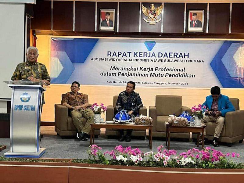 Dalam sambutannya, Asrun Lio menyampaika kepada pihak Asosiasi Widyaprada Indonesia (AWI) Sultra, termasuk kepada Balai Penjaminan Mutu Pendidikan (BPMP) Sultra untuk dapat berkolaborasi dengan lembaga yang telah dibentuk oleh Pemprov Sultra beberapa tahun lalu melalui Dikbud Sultra.
