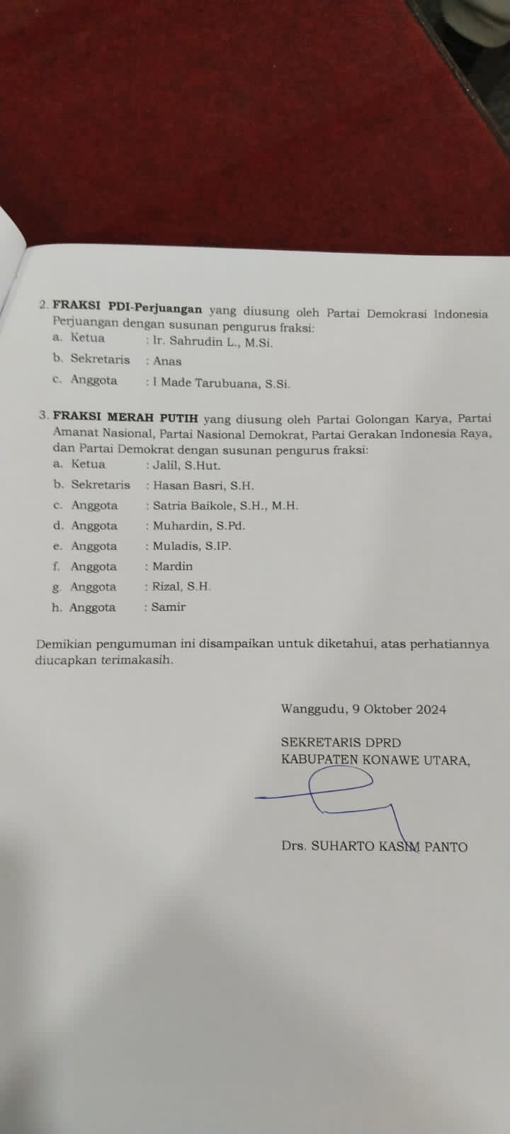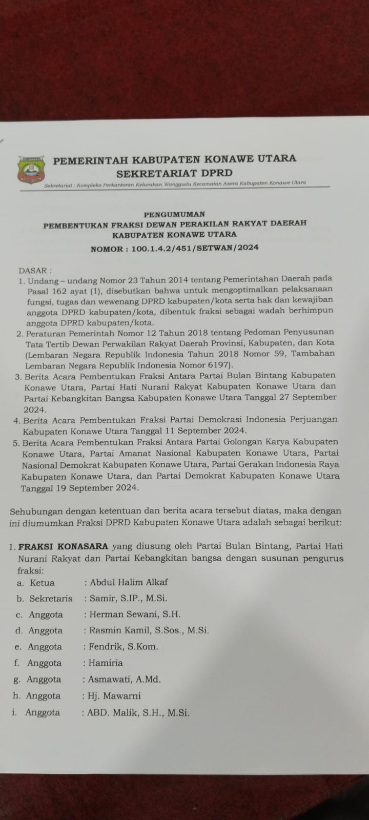Pengumuman pembentukan fraksi-fraksi dalam masa keanggotaan periode 2024-2029 disampaikan pada rapat Paripurna DPRD Kabupaten Konut beberapa waktu lalu.