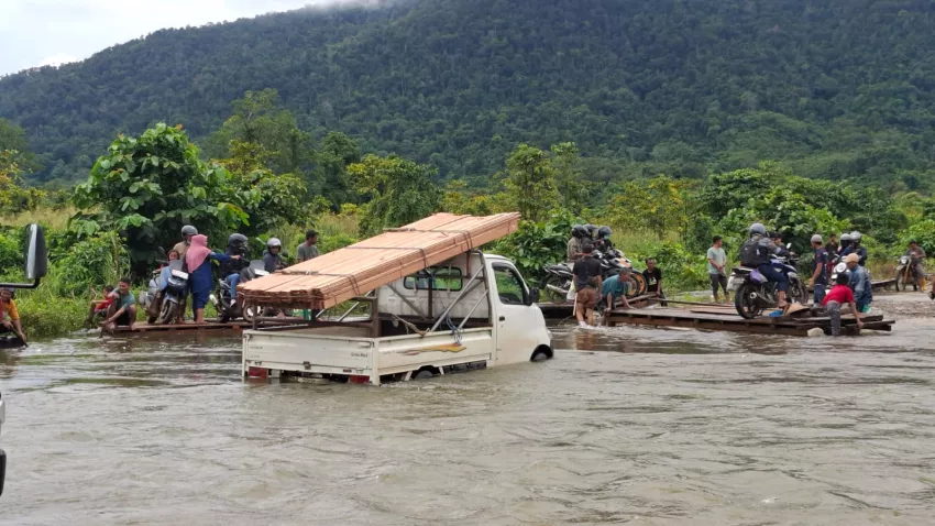 “Dari pantauan kami untuk kendaraan roda empat yang besar seperti mobil hi-lux masih bisa lewat. Sedangkan untuk motor harus naik pincara,”ungkap Wabup Konut, Abu Haera dilokasi banjir.